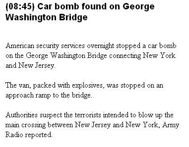 D’autres rapports font mention d’une camionnette blanche remplie d’explosifs interceptée à l’approche du pont George Washington ; voici ce qu’on pouvait lire dans le Jerusalem Post le 12 septembre : "American security services overnight stopped a car bomb on the George Washington Bridge. The van, packed with explosives, was stopped on an approach ramp to the bridge. Authorities suspect the terrorists intended to blow up the main crossing between New Jersey and New York, Army Radio reported."
