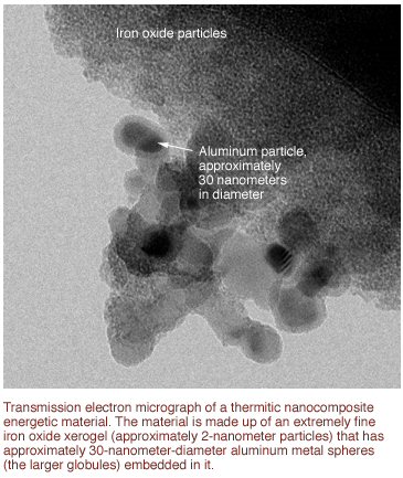 2) Cet article en ligne intitulé « La chimie à l’échelle nanométrique produit de meilleurs explosifs » discute de procédés par lesquels les nanothermites sol-gel sont fabriquées, et il propose une belle image (TEM) d’une de ces nanothermites.